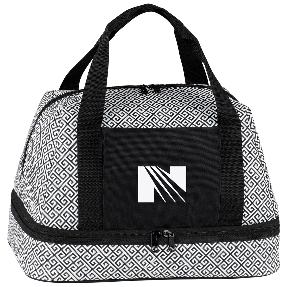 Stylish black and white casserole keeper tote. The top compartment has plenty of space (over 1000 cubic inches) for drinks, utensils, cold toppings, or anything else you might need at your destination. The bottom liner is heat-resistant and insulated to keep food warm.
