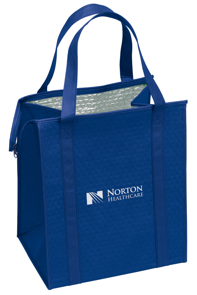 Premium non-woven polypropylene insulated tote with zipper closure, dual reinforced 20" handles, and plastic bottom insert Royal blue with white Norton Healthcare logo.