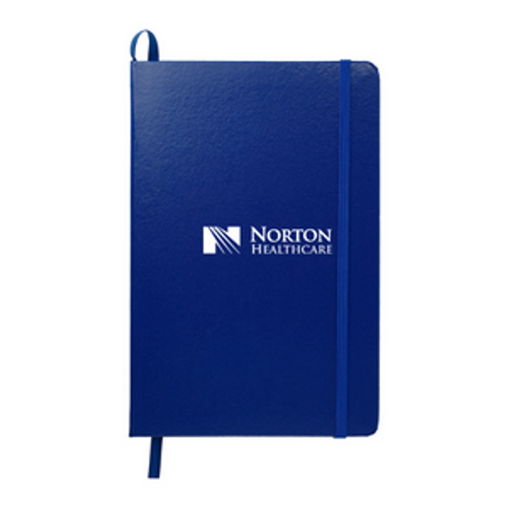 The 5.5" x 8.5" Ambassador Bound JournalBook is a hard cover bound journal with 80 sheets of cream lined paper. The JournalBook features built-in elastic closure, ribbon page marker, and expandable accordion pocket.